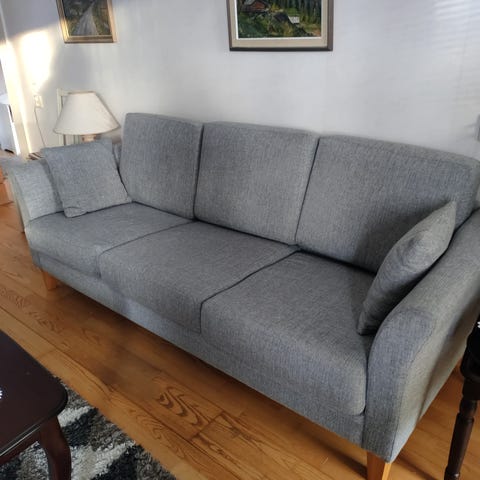Varsamt använd soffa, Burhéns, med grå klädsel, nytvättad. OBS kuddarna ingår ej.