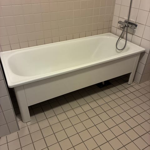 Badkar med vit yta och handtag monterat på insidan. Utrustat med duschvägg i glas. Passar för badrum med kaklade väggar. Handtaget ger stöd vid användning.