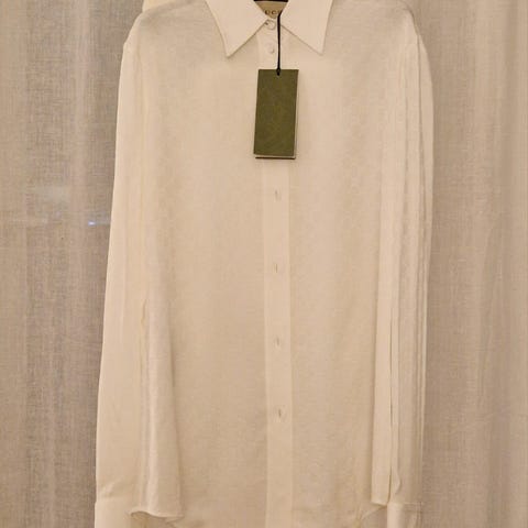 Eleganta, svarta kritstrecksrandiga byxor med resår i midjan och en diskret Gucci-logga.