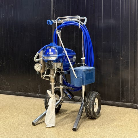 Graco Mark V Pro II är en målarpistol utrustad med slang och hjul för enkel transport. Produkten är avsedd för professionell användning och är konstruerad för att applicera färg effektivt på olika ytor.