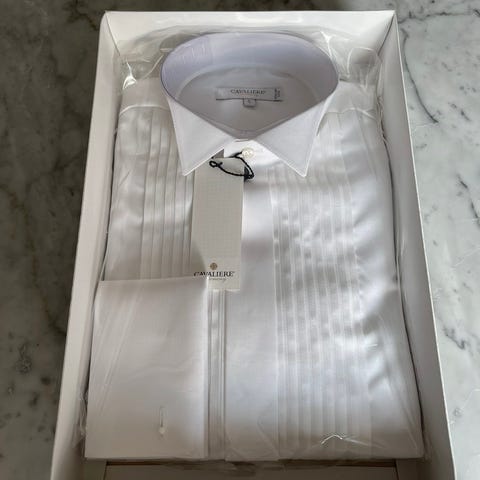 Stenströms smokingsskjorta - modell Slimline med veckad front, dold knappslå, snibbkrage, pärlemorknappar och dubbel manschett, nypris 1899 kr: