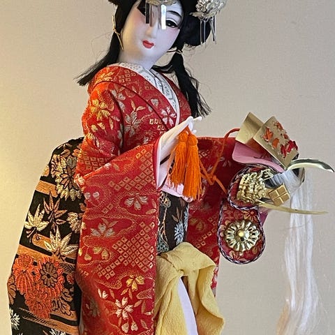 Set med flera Kokeshi dockor tillverkade i trä med olika färger och mönster. Dockorna har en enkel, rund form och varierande dekorativa detaljer. Passar som samlarobjekt eller som inredningsdetalj.
