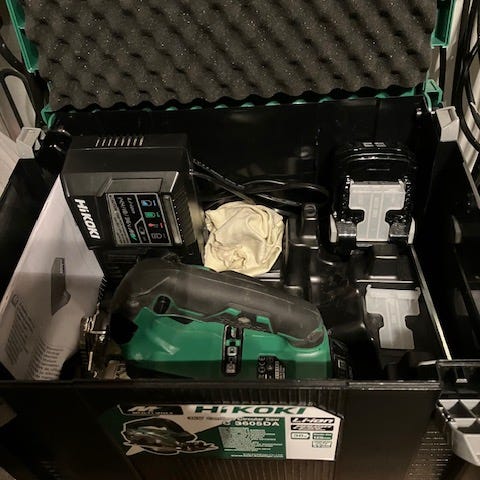 HiKoki DS18DSDL2 borrmaskin med batteri och laddare. Maskinen är grön och svart och levereras i ett bärbart plastfodral. Batteridriven med laddare inkluderad för enkel användning och transport.
