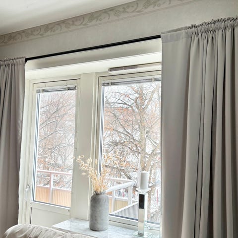 3 längder puderrosa sammetsgardiner samt mörkläggnande. Använd några få månader, ser helt nya ut. Djur och rökfri hem.