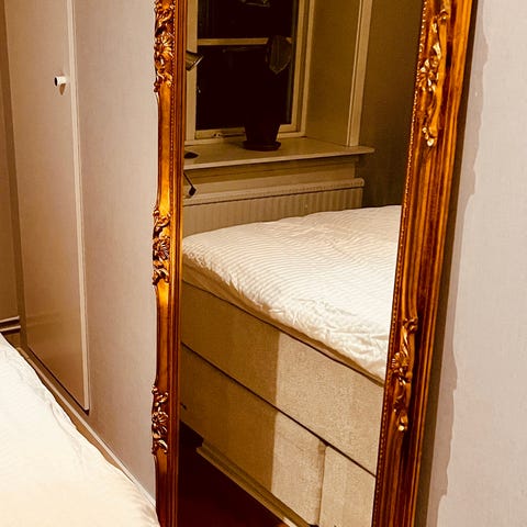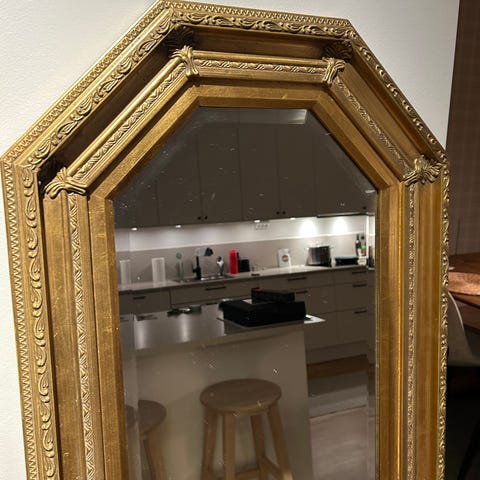 Köptes på auktion för många år sedan. Spegeln är utan skador och har vajerfäste på baksidan för att kunna hängas åt båda hållen. Spegeln har baksida i trä, och ger ett exklusivt intryck.