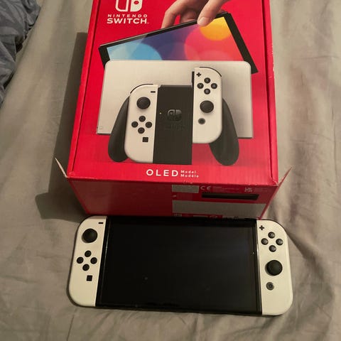 Säljer sonens Nintendo Switch spelkonsol med Joy-Con-kontroller. Konsolen är bärbar och har en pekskärm. Inkluderar laddare, dockningsstation och förvaringsväska. Passar för spel på både TV och i bärbart läge.