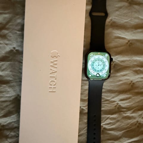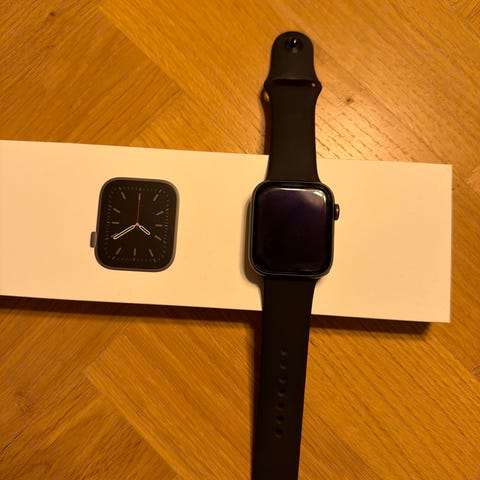Apple Watch Series 8 smartklocka med svart armband. Klockan har en rektangulär skärm och är designad för att användas som en smart enhet med funktioner för tidtagning, hälsa och kommunikation.