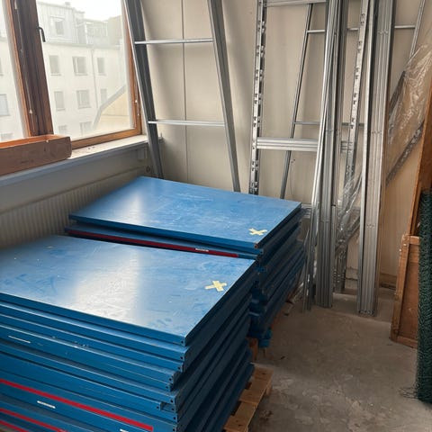 Metallhyllsystem med flera hyllplan för förvaring av olika föremål. Hyllan är avsedd för användning i lager eller förråd och erbjuder robust och stabil förvaring.