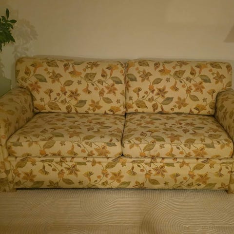 En hörnsoffa / bäddsoffa bortskänkes. Skadad i mitten, nertryckt, går säkert att fixa. Annars helt okej skick. Unik design.