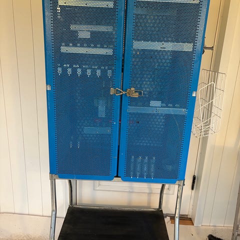 Rullbart verktygsskåp med olika krokar och hyllor för förvaring av verktyg. Skåpet är uppdelat i sektioner med perforerade metallväggar för flexibel placering av krokar och hållare. Färgerna är huvudsakligen röd och blå. Används för organiserad verktygsförvaring i verkstäder eller liknande miljöer.