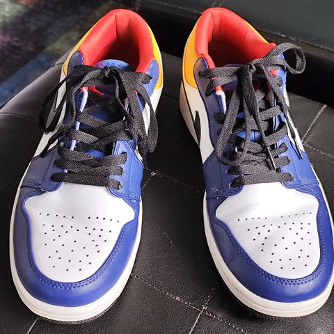 Snygga Nike Zoom Freak 2 sneakers i en unik färgkombination av blått, lila och grönt. Perfekt för både sport och vardag. Detaljerad design med mönstrade snören och Nike-logga.