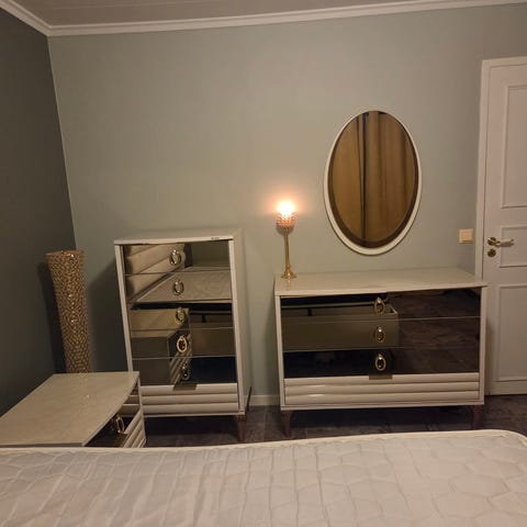 Sminkbord, byrå och sängbord i mörkt trä med svart skiva och tillhörande spegel med rundad överkant. Sminkbordet har sex lådor och en öppen yta under bordsskivan. Sängborden har två lådor. Byrån har tre stora lådor. Allt i matchande design och material.