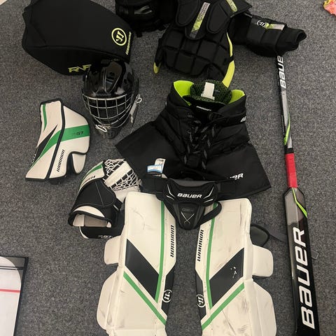 Använt av spelare med kroppslängd 130-140 ca. Målvaktsmasken är hel, fräsch och i mycket bra skick med ett par år kvar på bäst-före-märkningen. Benskydden har justerbar knäficka så barnets längd är inte lika kritiskt som på andra skydd, utan kan enkelt anpassas individuellt. Handskarna är till spelare som kör vänster/regular, dvs plockar med vänster hand och håller klubban i höger hand (med klubbspetsen åt vänster sida).