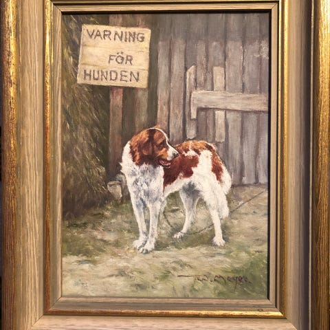 Konstverket föreställer en hunds ansikte med tydliga detaljer och en blandning av färger som orange, lila, grönt och vitt. Passar som dekorativ väggmålning.
