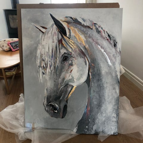 Färgglad stor oljemålning på duk med flera färger och textur.