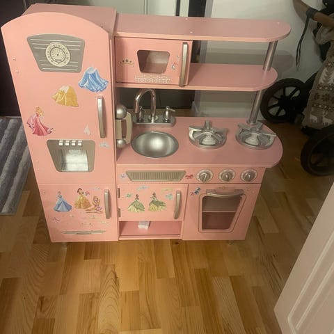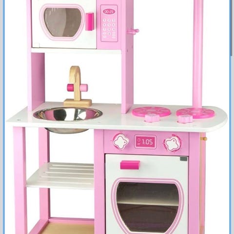 Jabadabado barnkök i trä med rosa färg. Kök med spis, ugn och mikrovågsugn, designat för barnlek.