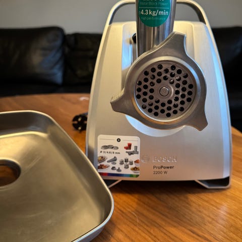Menutt Köttkvarn med effekt på 230V, 800W i vit färg. Levereras med tillbehör för köttberedning. Passar för hemmabruk och köksanvändning. Helt ny och använd.
