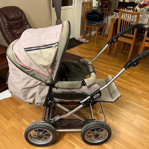 Fin och rymlig vagn. Pumpbara däck. Gråbrun med skinndetaljer