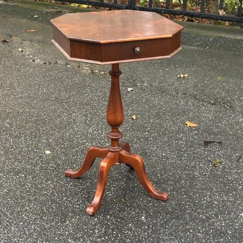 Ett charmigt, antikt sidobord med en unik design. Dess unika form och klassiska stil gör det till ett perfekt tillskott till en mängd olika inredningar. Kombinationen av läder och trä gör det till ett idealiskt dekorativt element för ditt hem.