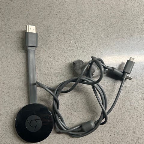 Google Chromecast mediaspelare för strömning av digitalt innehåll. Enheten är svart och ansluts via HDMI-port.