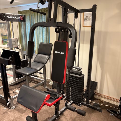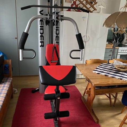 Weider Multigym hemmagym träningsmaskin i svart färg. Utrustad med flera träningsstationer för olika övningar. Passar för hemmabruk och styrketräning.