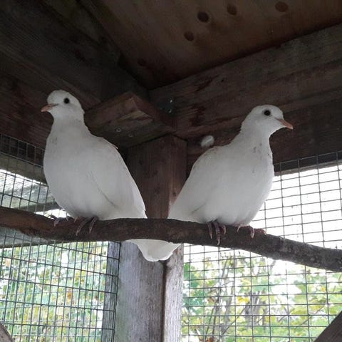 Eftersom de är tama så är det inga problem att ha på dem så kallade ”pigeon pants” så att de kan vara lösa inomhus utan att man får bajs överallt. De bor utomhus just nu men trivs även inomhus.