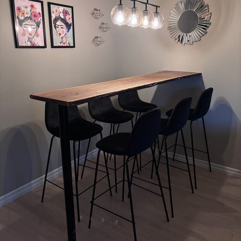 Midori Barbord delad skiva oljad vildekfanér ,underrede svartlackerad metall/trä + 4 st barstolar höj & sänkbara. Inköpt på MIO. Ordinarie Pris 7795 kr