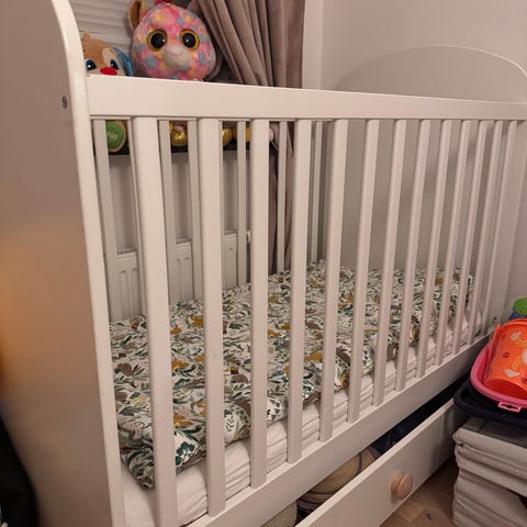 Snigel Spjälsäng från Ikea . Den är använd men inga skador , den är målad . Alla skruvar och tillbehör tillkommer. Madrass och spjälskydd.