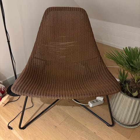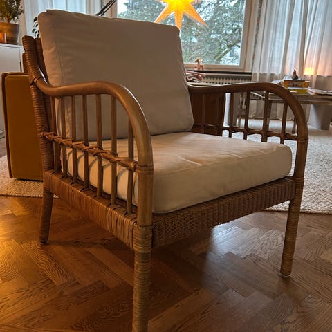 Säljer en svart fåtölj från IKEA. Storsele är en handgjord rottingfåtölj med hög rygg och rundade former. Design av Carl Öjerstam. Höjden mäter 100cm och bredden 50-69 cm. Säljes med tillhörande sittdyna.