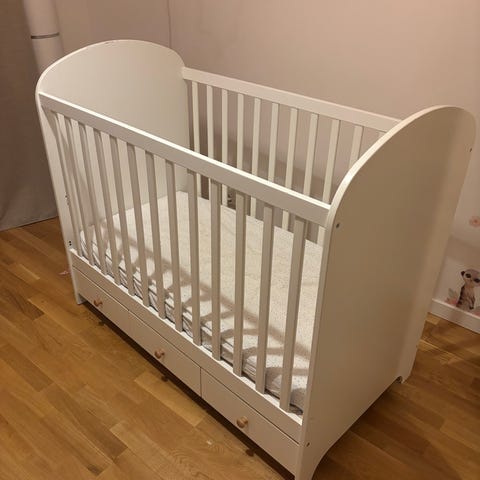 Mycket varsamt använd spjälsäng med tillhörande underlåda, inklusive madrass, täcke och kudde.