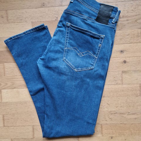 Ett par mörkblå jeans från Replay. Jeansen har en klassisk design med detaljer som den ikoniska Replay-logotypen på bakfickan och en stilren passform.