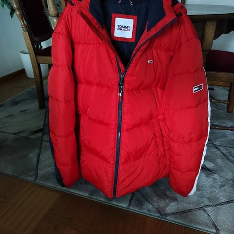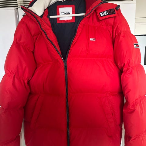 Tommy Hilfiger Vinterjacka i storlek XXL för män. Jackan är gul och tillverkad av dun, vilket ger isolering och värme. Den är avsedd för utomhusbruk under kalla förhållanden.