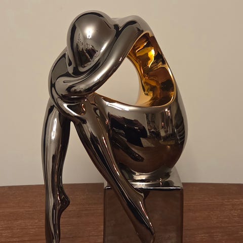 Art Deco skulptur i metall med en bas av Figuren föreställer en person i en dynamisk pose med utsträckta armar och ett ben lyft. Mycket sällsynt