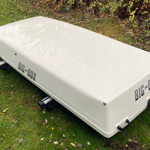 En grå Thule takbox (ca 17 år gammal) med tackräcken som passar på en Volvo V70 (2012 års modell).