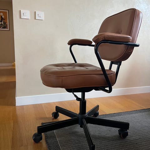 Kontorsstol i vitt skinn med kromade armstöd och fem hjul för rörlighet. Stolen har vadderad sits och ryggstöd med två vadderade sektioner.