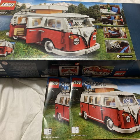 Klassiskt VW-retroset i ikonisk blå färg, med surfbräda och kylbox.