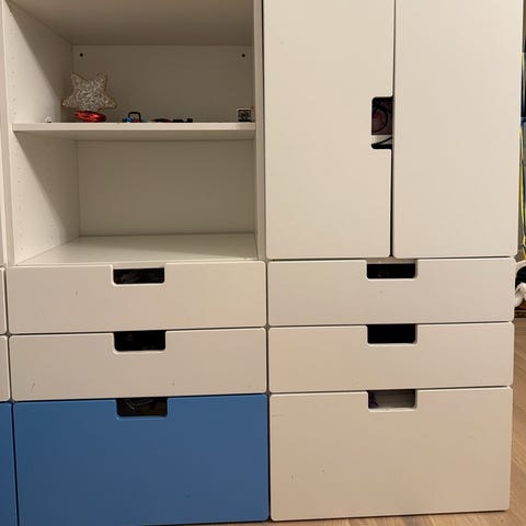 En möbelgrupp för barnrum med fyra delar, bestående av tre garderober och en byrå.