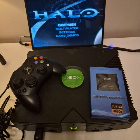 Microsoft Xbox Original konsol crystal med kontroll. Konsollen har chipp (Xcalibur) i sig, men jag har sett till att rensa alla hårddiskar för att återställa till normal BIOS.