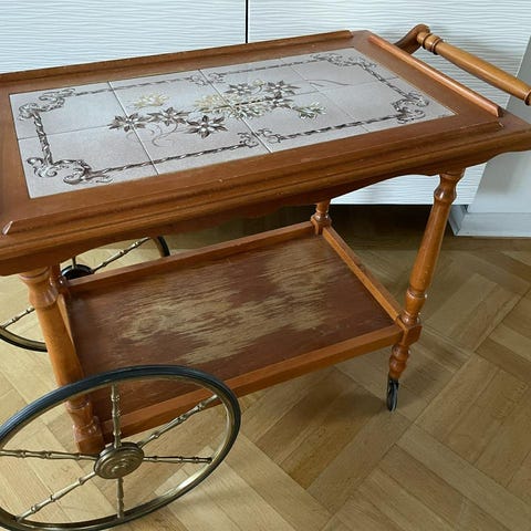 Drinkvagn med avtagbar bricka överst. Fint skick. Guldig. Går att rulla, den har 4 gjul.