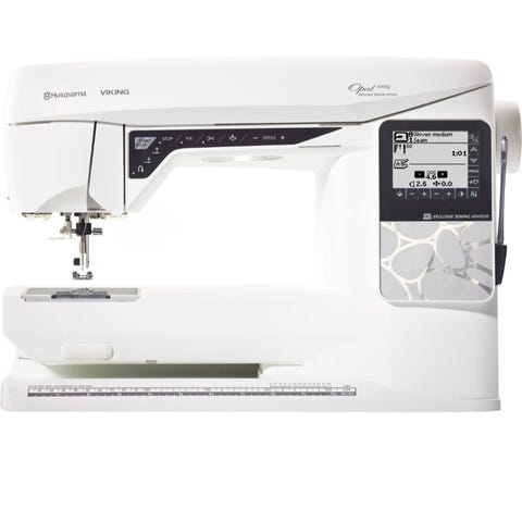 Husqvarna Viking Quilting 545 symaskin med inbyggd digital display och tangentbord för val av sömmar. Maskinen har flera sömnadsfunktioner och mönster, inklusive dekorativa stygn. Tillbehör som manual och extra delar medföljer.