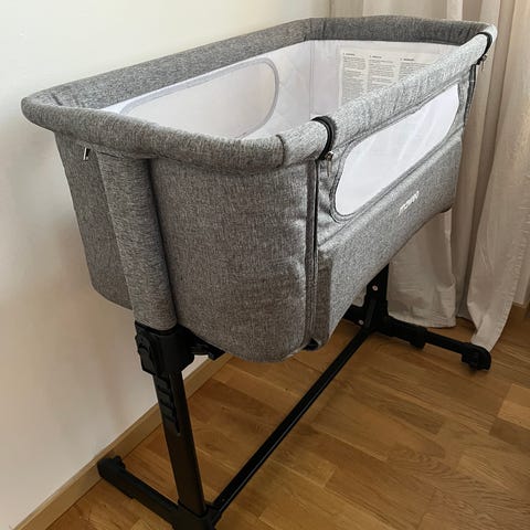 Höj och sänkbar. Hjul. Gungfunktion. Insektsnät. Förvaring. Färgen är grå.