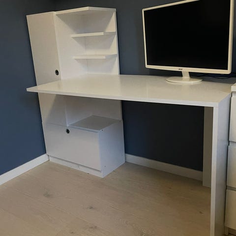 Fint skrivbord med extraskiva inkl. hurts och väggskåp.
