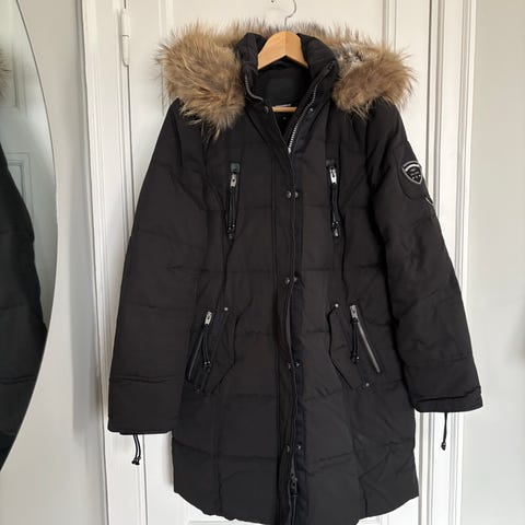 Svart vadderad jacka med huva och dragkedja. Jackan har en justerbar midja med bälte och flera fickor med dragkedja och knappar.