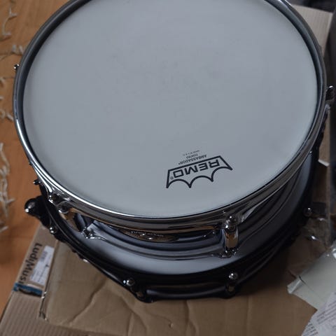 Det sitter clear Pinstripes över Attack 1-ply clear på samtliga pukor. Bastrumman har sprillans Pinstripe med EMAD-dämpring på slagsidan och Evans EQ3 som reso. Kitet låter som en rockdröm och bara skinnen på 22" kostar 1500kr så hoppas priset känns rimligt.