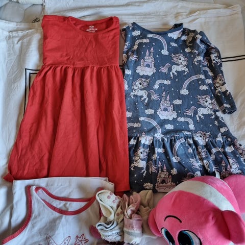 Allt i stl 98 förutom den rosa koftan som har stl 100 och byxorna till den stl 110