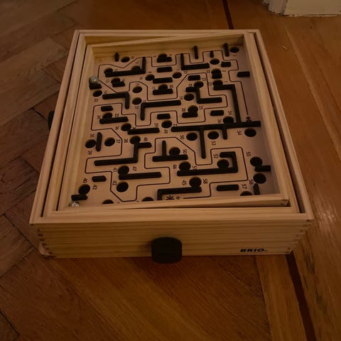 BRIO Labyrintspel i trä med en labyrintdesign som spelas genom att vrida handtag för att styra en kula genom banan. Spelet är tillverkat i trä och är lämpligt för barn från 6 år och uppåt. Oanvänd.