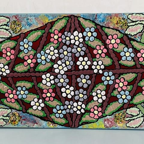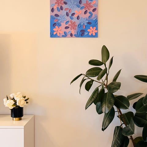 Handmålad tavla med blommotiv i pastellfärger. Målningen har en texturerad yta och tredimensionell effekt då modellpasta använts. Tavlans färgpalett inkluderar ljusblått, gult, rosa och grönt. Passar som dekorativ väggkonst i olika rum.