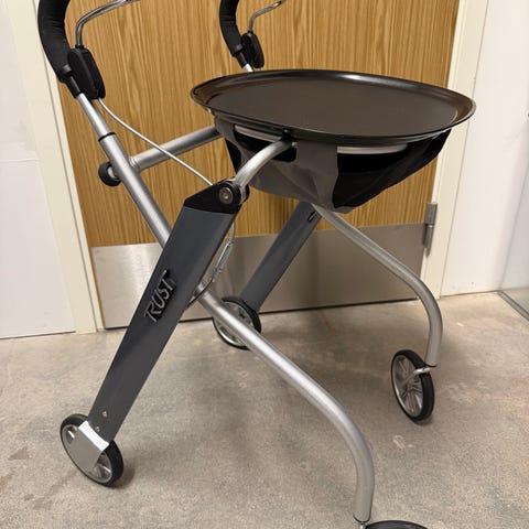 En mycket fin röd Rollator som du kan använda inne eller ute. Av högsta kvalitet och smidig att fälla ihop. Man kan sitta och vila på den och köra kassar i korgen. Några små färgskav finns. Se bilder. Nypris ca. 6000:- Fynda!