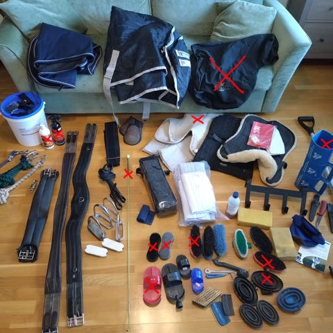 Allt är helt och i bra skick, men det finns tecken på användning och vissa par ridbyxor är lite noppriga.