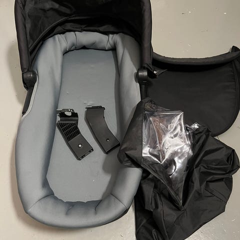 Thule Urban Glide bassinet / liggdel i grått. Medföljer regnskydd, myggnät och adaptrar till både liggdel och babyskydd. Enstaka mindre fläckar finns som nog går att tvätta bort, annars fint felfritt skick. Alltid förvarad inomhus.